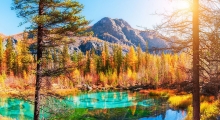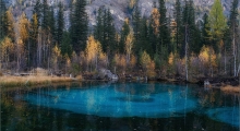 Гейзерное озеро — один из уникальных уголков Горного Алтая. Водоем привлекает к себе отдыхающих удивительным оттенком воды и необычными рисунками на дне, которые были сформированы глинами, — благодаря причудливости их часто сравнивают с изображениями, оставленными «инопланетянами». Водоем сравнительно небольшой, диаметр его составляет 30 метров, а глубина — не более 2 метров. Он расположен недалеко от поселка Акташ.