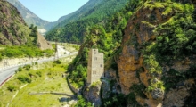 Слева от входной арки можно увидеть нишу, которая образовалась между стеной башни и скалой из природного камня. Если зайти в неё, откроется красивый вид на горные вершины вдали. В самом сооружении чисто, установлены современные перекрытия из бетона и та самая сварная лестница без перил. По бокам в стенах находятся открытые окна, сверху закруглённые.