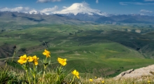 Весной на горных лугах распускаются цветы и травы. Их в Приэльбрусье насчитывается более 3000 видов. Здесь можно встретить колокольчик доломитовый, берёзу Радде, нут, каменоломку, волчеягодник обыкновенный, покрытосеменные травы. Насекомых у подножия горы тоже множество, 15% из них до сих пор не изучены наукой. Чистая вода ледников превращается в ручьи, где обитает форель.