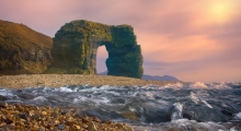 Арка Стеллера — уникальное нерукотворное сооружение в виде арки высотой 20 метров. Природный памятник был назван в память об участнике 2-ой Камчатской экспедиции Георге Стеллере. Находится эта достопримечательность в 40 километрах от села Никольское, она представляет собой главный символ биосферного заповедника Командора. Удивительно осознавать, что это сооружение создал не человек, а сама природа.
