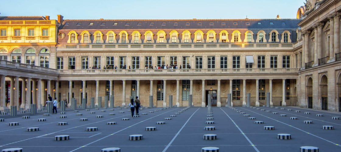 Во внутреннем дворе Пале-Рояля находится инсталляция Les Deux Plateaux, более известная как «Колонны Бюрена». Она была создана в 1985–1986 годах французским концептуальным художником Даниэлем Бюреном и представляет собой сотни колонн, облицованных вертикальными черно-белыми полосами. Чёрно-белая полосатая графика призвана переосмысливать визуальное восприятие пространства, что типично для художественной практики мастера.