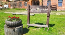 Копии средневекового вооружения и доспехов выставлены в оружейной. Экспонаты не представляют исторической ценности, их можно примерить, сделать красивые фото. Пол небольшого помещения выстелен досками, стены из красного кирпича частично оштукатурены. На потолке висят большие балки. Повсюду расставлены щиты, украшенные различными знаками. На стене висят шкура кабана, нагрудник и шлем рыцаря Тевтонского ордена.